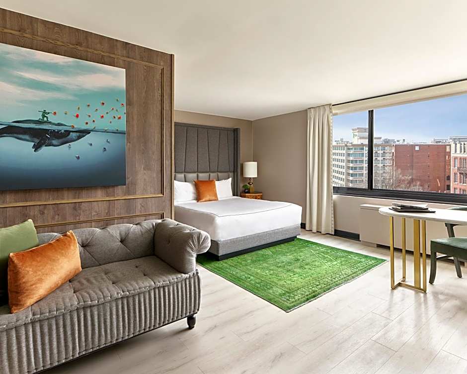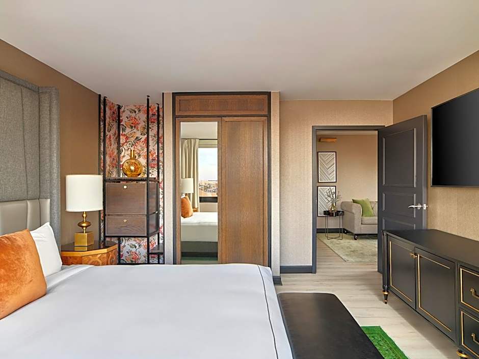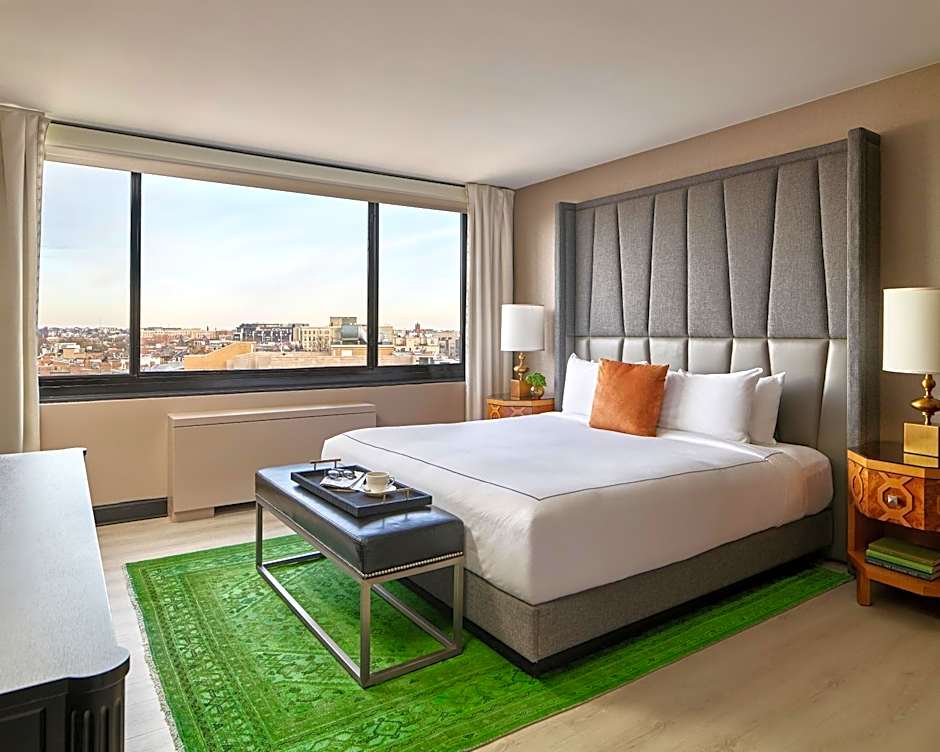 This room has one king bed with 400 thread count Frette linens and an oversize glass enclosed shower with an eco-friendly rain shower head.